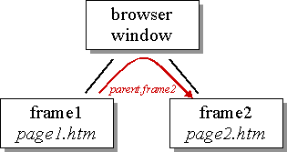 From the window's point of view the two frames are called frame1 and frame2. You can see in the image above that there is a direct connection from the parent window to each frame. So if you have a script in the parent window - this means in the page that creates the frames - and you want to access the frames you can just use the name of the frame. For example you can write: